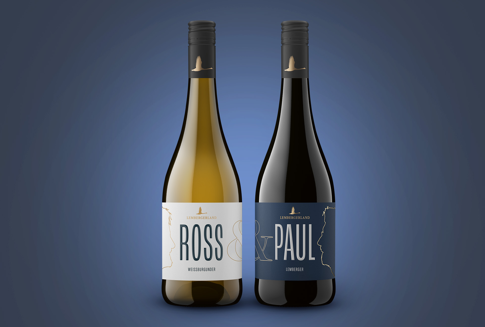 Da Ross & Paul das Weinprojekt ihrer Liebe und der gegenseitigen künstlerischen Wertschätzung gewidmet haben, haben wir ein Etiketten-Duett für sie entworfen. Mit goldgeprägten Scherenschnitt-Konturen der einander ansehenden Protagonisten und ihren durch das „&“-Zeichen verbundenen Namen bringt unser Design die Weine im Regal genauso eng zusammen, wie die beiden Künstler es im echten Leben sind.